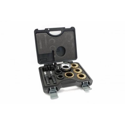 Set de mecanizado de corona de horquilla profesional. Mecanizadora profesional para fresado tanto del borde exterior como de la superficie inferior del asiento de rodadura de la corona de la horquilla, lo que garantiza un corte suave, preciso y correctamente alineado con el cuadro.